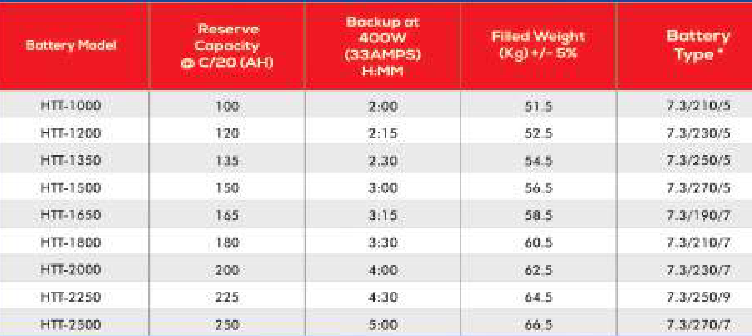 - Cut-off voltage 1.75Volts / Cell at C/HO Capacity