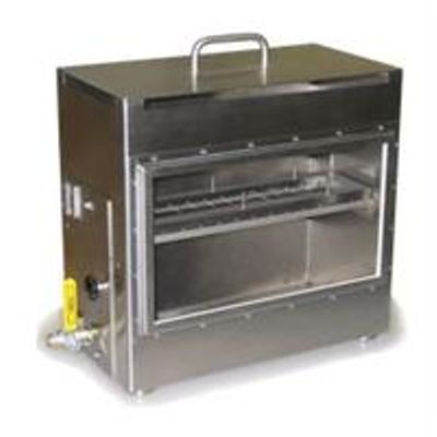 - Burner box with fireproof glazing at the front, door with Bunsen burner at the side, pressure-reducing valve at the rear and top cover with handle (with optional thermometer mount); all parts made of stainless steel for long-term maintenance-free use