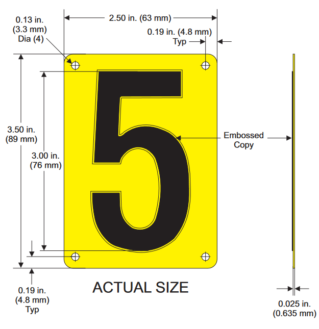 Same tags can be used for both horizontally and vertically oriented installations by using either vertical or horizontal aluminum tag holders. The tags can also be nailed, screwed or riveted without a holder.