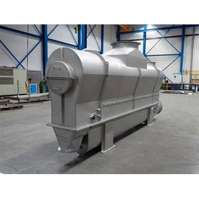 How does a fluid bed dryer work? A continuous fluid-bed system is a machine in which a continuous flow of “wet” powder, granular or flakes material is conveyed over a perforated bed. Hot drying air is blown through the holes of a perforated plate. The wet solids are lifted from the bottom and causes the solids to behave as a fluid. The air velocity is adjusted to keep the moving layer of material fluidized. Conveying of the product is achieved by means of a low-frequency, high amplitude shaker mechanism. The “Shaking” motion plug flow of the Tema fluid bed, allows first-in, first-out drying of products and well-mixed fluidization, which covers the entire spectrum and is able to accurately control the spread of residence time.