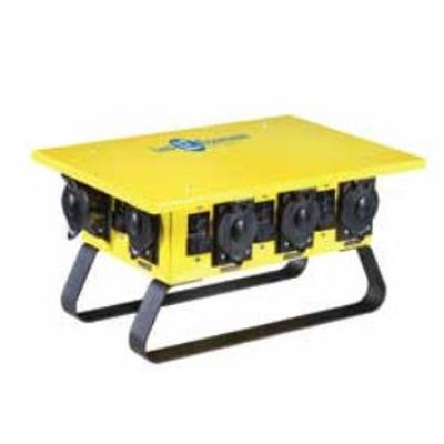 The "Spider Box" Temporary Power Distribution Unit is designed to safely distribute temporary power on jobsites. It is appropriate for outdoor use and designed to stand up to the toughest workplace conditions. The 120V/20A receptacles are protected by individual GFCIs with power on indicators. The outlets also provide open neutral and reverse phasing protection. The system uses a 50A California Standard power inlet that then distributes power to seven receptacles and 50A California Standard pass-thru power outlet for daisy-chaining additional units. In addition to the six 125V/20A receptacles, each unit has one non-GFCI twist-lock receptacle rated 250V/30A. Over current protection is provided by a full complement of circuit breakers located under the easy-access side panel. cULus certified.