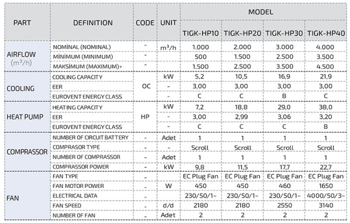 The TIGK-HP heat pump heat recovery ventilation units are designed to achieve high indoor air quality as well as energy saving. When heat transfer is done with air-to-air heat recovery plate heat exchangers used in TIGK-HP devices, fresh air is obtained at room temperature thanks to the heat pump. Standard heat recovery devices provide an average blowing temperature of 30°C in summer and 12°C in winter and these temperatures can disturb the person in terms of comfort. Heat pump heat recovery devices, thanks to the heat pump, 20°C in summer, 25°C in winter fresh air blowing temperature can be obtained.