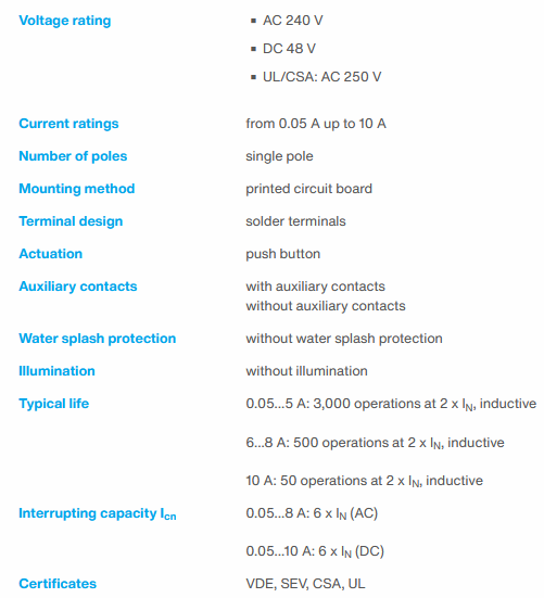 Miniaturised single pole thermal circuit breaker with push-to-reset tease free, trip-free, snap action mechanism (R-type TO CBE to EN 60934) for PCB mounting. Approved to CBE standard EN 60934 (IEC 60934). For higher current ratings see type 1140.