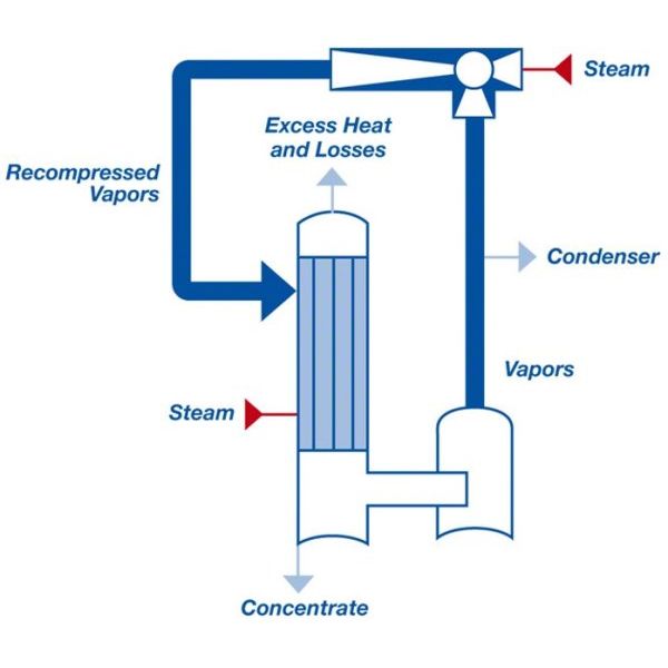 The thermal vapor recompression (TVR) builds on the same principle as the mechanical alternative, but uses only a portion of the resulting vapor for heating the system. The compression of the steam for heat recovery takes place in a steam jet pump. This is usually designed for a specific operating point and works on the jet pump principle. A certain amount of steam, the so-called motive steam, is required for the operation of a thermal vapor compressor. The resulting energy savings correspond in many cases in about an additional evaporator stage.
