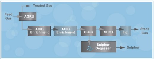 The THIOPAQ O&G process can replace a complete train of H2S removal and sulphur recovery installations. Another option is to retain the amine unit (for example, when CO2 removal is also required) and only replace the sulphur recovery unit, the tail-gas treating unit, the degasser and, possibly, the incinerator with a single THIOPAQ O&G train.