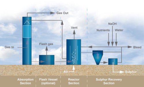Depending on the sour gas pressure, the sulphide-loaded or rich solution is routed to a flash vessel or directly to the bioreactor, which is operated at atmospheric pressure and ambient temperature, and where the micro-organisms oxidise the sulphide to elemental sulphur. The lean solution is recirculated to the absorber, while part of the lean solution is routed to the sulphur recovery section, in order to remove sulphur from the system.