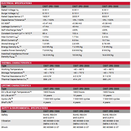 Rated voltage 3VDC. 1500F up to 3000F capacitance. High cycle life of 1 million cycles. Excellent DC life performance. Very high energy and power density. Threaded terminals M 12. Environmentally friendly product.