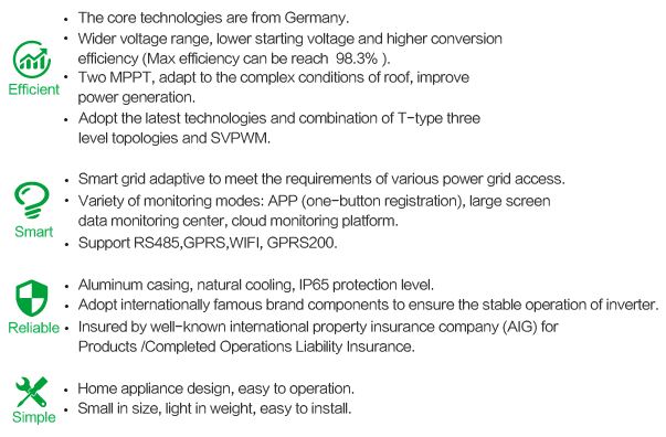 iMars BG 4-10kW (small three-phase) photovoltaic grid connected inverter is a photovoltaic group series inverter developed for villas and small commercial users. It uses advanced T three level topology and SVPWM (space vector pulse width modulation) technology. It is small in size, light in weight, easy to install and maintenance, and is very cost-effective, for family and commercial use. Distributed photovoltaic systems provide more flexible solutions.