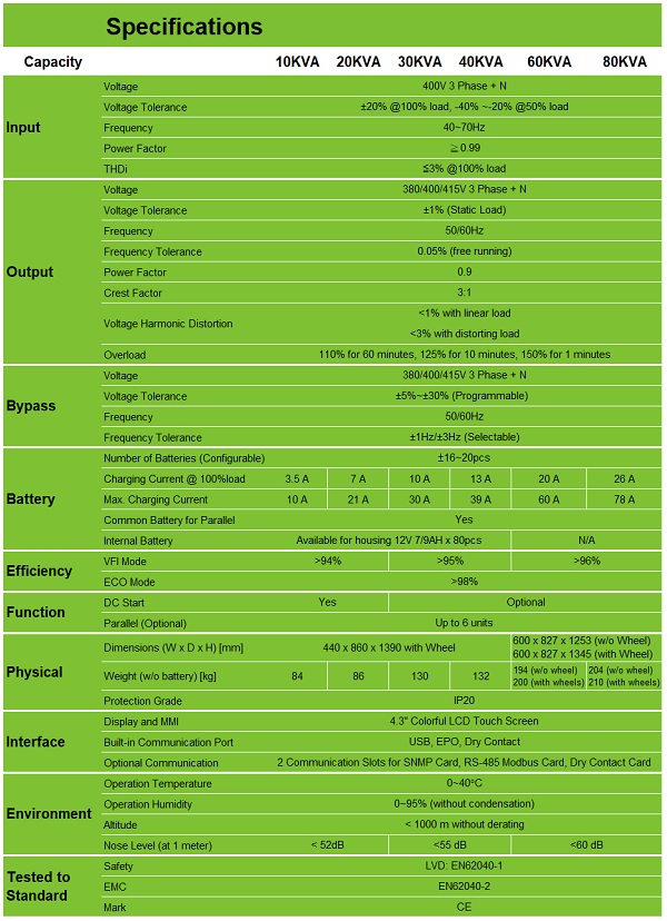 3 Level IGBT Technology. 96% Efficiency in Online Mode. High Input Power Factor greater than 0.99. Output Power Factor 1.0. Operates Leading and Lagging Loads without Derating. Power Scalable and Parallel Redundancy. Built-in High Current Battery Charger. Wide Range and Flexible Battery Configuration. Standard Separate or Common Batteries for Parallel Systems. Strong Over Load Capacity. Advanced Operation Interface - Colorful LCD Touch Screen.
