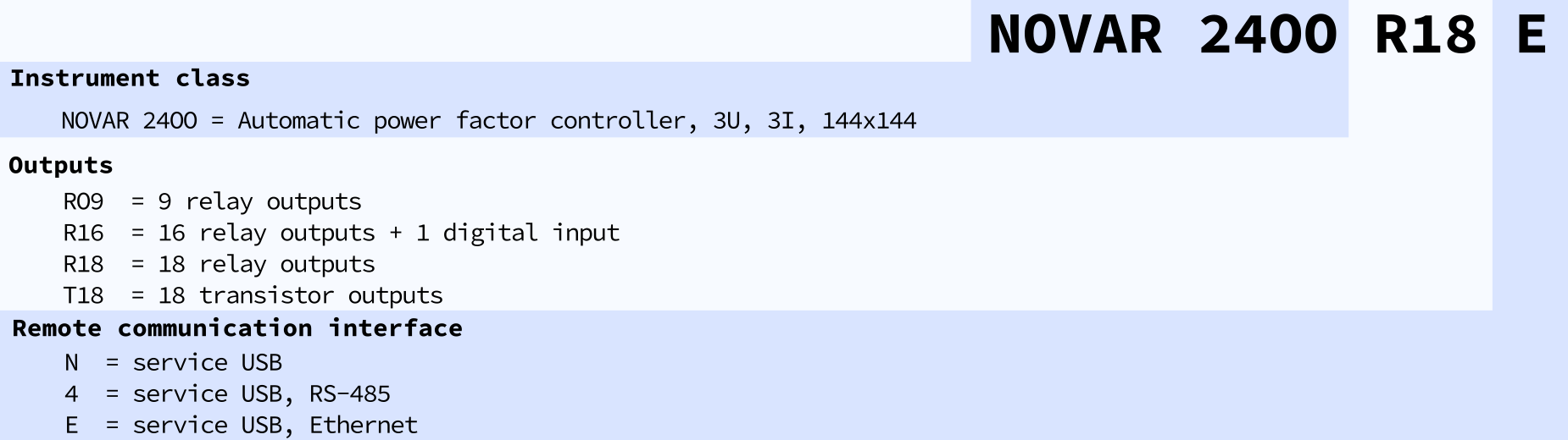 The NOVAR 2400 is a new model of the innovated NOVAR 2xxx PFC line. It builds on powerful modern platform shared among other PFC and PQ instruments and offers fast three-phase measurement and control combined with multi-functional panel meter. Fast Ethernet with web server, modbus, SNTP and other features and RS-485 serial line can be used to remotely control and supervise the compensation cabinet. Manipulation with instrument data and configurations can be restricted only to authorized users and all Ethernet communication can be optionally secured by encryption. NOVAR 2400 shares its key features and parameters with NOVAR 2100/2200 and NOVAR 2600 controllers.