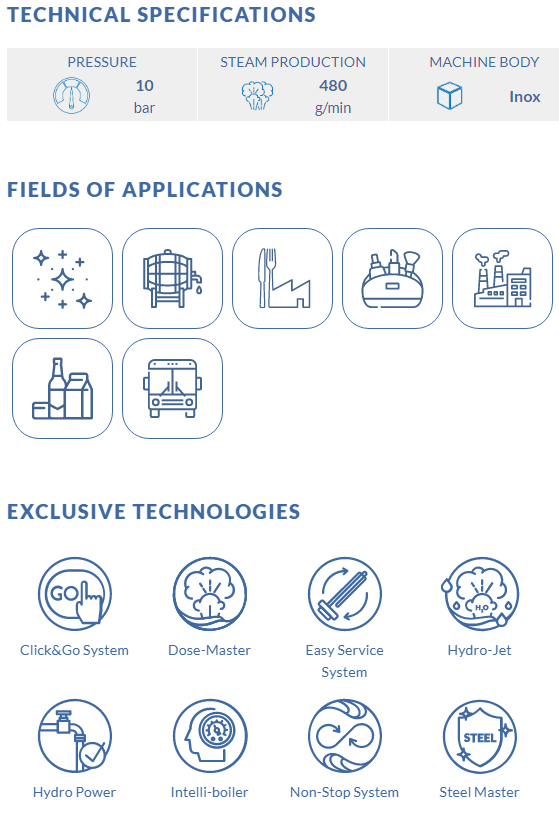 GAISER 18000 is a three-phase steam generator for industrial use . Gaiser 18000 is the most powerful model of the line. It is a machine with large dimensions, with a sturdy steel body, which delivers a continuous flow of steam, and is therefore ideal for the most demanding applications.