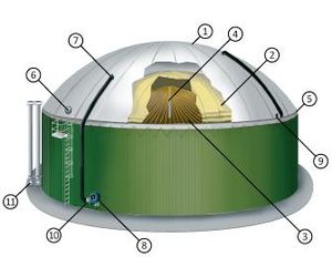The tank mounted TECON Double Membrane Gas Storage System consists essentially of an outer membrane, an inner membrane and an optional brace system with a center pole. The actual gas storage function is done by the inner membrane, which in conjunction with the supporting air blower, provides a constant operating pressure. The operating pressure is kept constant via a pressureregulating valve. The outer membrane provides the shape of the biogas storage and absorbs loads from wind and snow. The brace system prevents the inner membrane from being damaged by the agitator at low biogas levels.