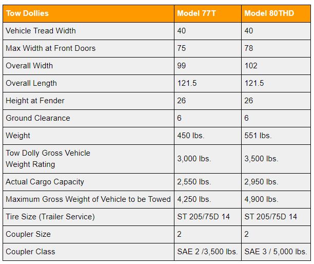 For towing small to mid-size cars. Max towed vehicle gross wt 4.500 lbs. (towed vehicle tread width 40" - 77"). For towing small to full-size cars, and some vans & trucks. Max towed vehicle gross wt 4.750 lbs. (towed vehicle tread width 40" - 80").