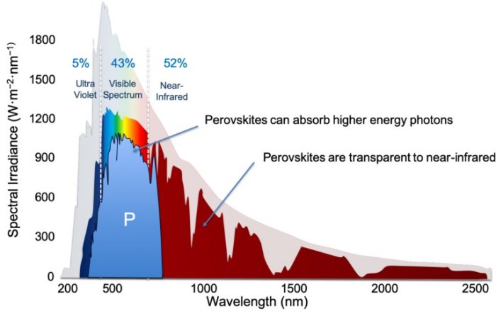 Peroskites are very efficient at absorbing high-energy photons in the ultraviolet and visible spectrum. Absorption quickly drops off at 780 nm, making perovskites essentially transparent to the near-infrared spectrum where more than half of the total available energy is located.