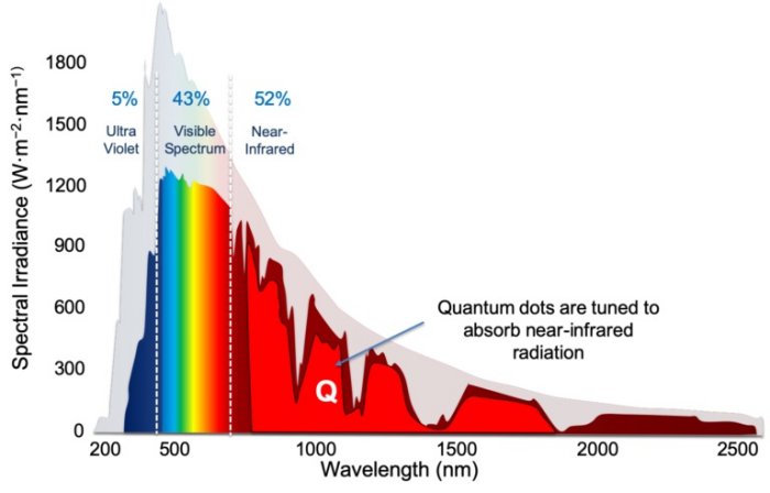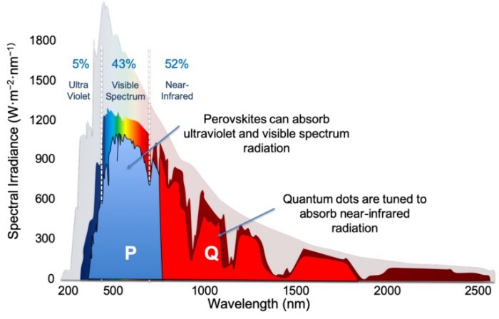By tuning the size of quantum dots, they can absorb the low-energy photons in the near-infrared and infrared spectrum above 800nm that pass through the perovskite layer.