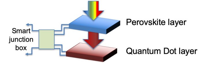 Our tandem module consists of two solar modules, each with different absorption materials with different wavelength sensitivity, stacked on top of each other. By combining our two complementary materials (perovskite and quantum dot), the resulting solar module can absorb a greater percentage of the available solar radiation. Our tandem solar modules require a mechanism, in the form of a smart junction box, to combine the power generated by the two solar cells.