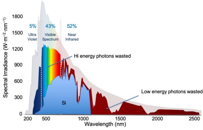 Silicon is a remarkable solar material, but comes with the limitation that it can harvest only a limited amount of the sun’s total radiation. It misses out on generating power from some of the ultraviolet spectrum energy as well as near-infrared radiation. This limits the potential for full radiation conversion.