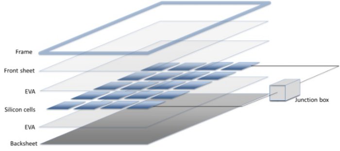 A traditional silicon solar panel is made up of many small silicon solar cells that are wired together and then laminated and framed into a panel, which is wired to a junction box.