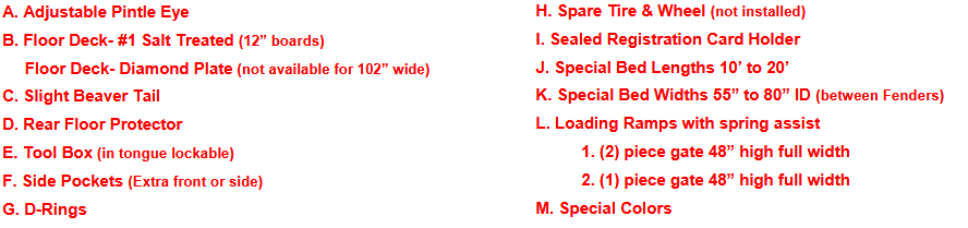 Bed Length 21` (Including 5` Beaver Tail). Bed Width 96`. Overall Length 27` (Including 6` tongue). Bed Height 34`. Weight 4,175 lb. (Approx.).