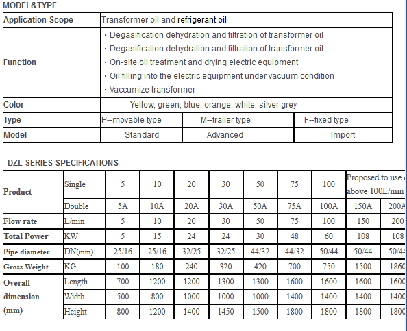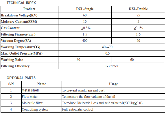 The main function of DZL Series single & double stage high-efficient vacuum oil purifier is to remove dissolved water, gas and mechanical impurities from insulating oil so as to ensure its purity and improve its insulation property. It is suitable for the application to oil treatment 500KV super-voltage transforming equipment and 220KV transformer. It is also suitable for the treatment of capacitor oil, transformer oil and freezer oil.