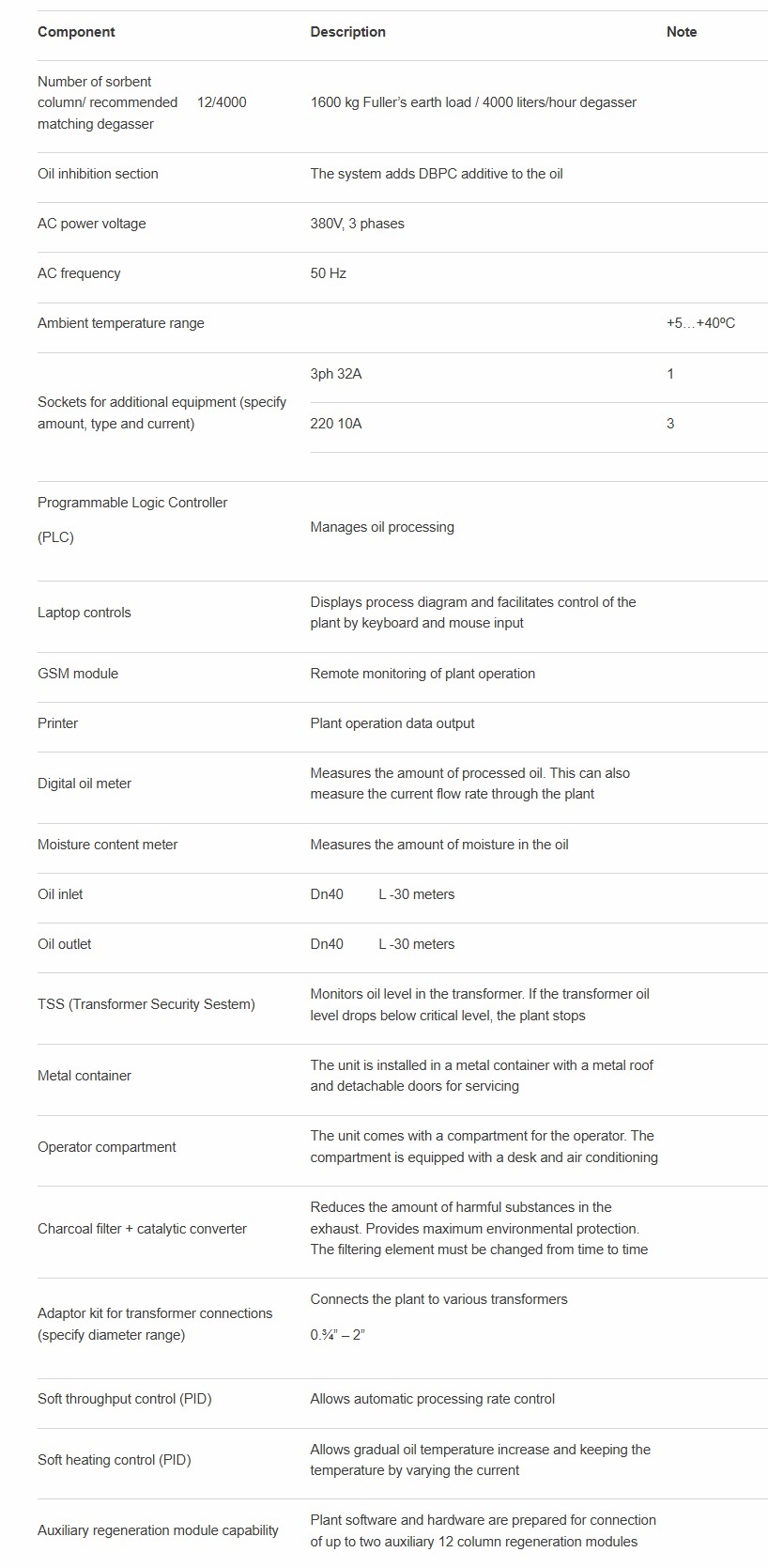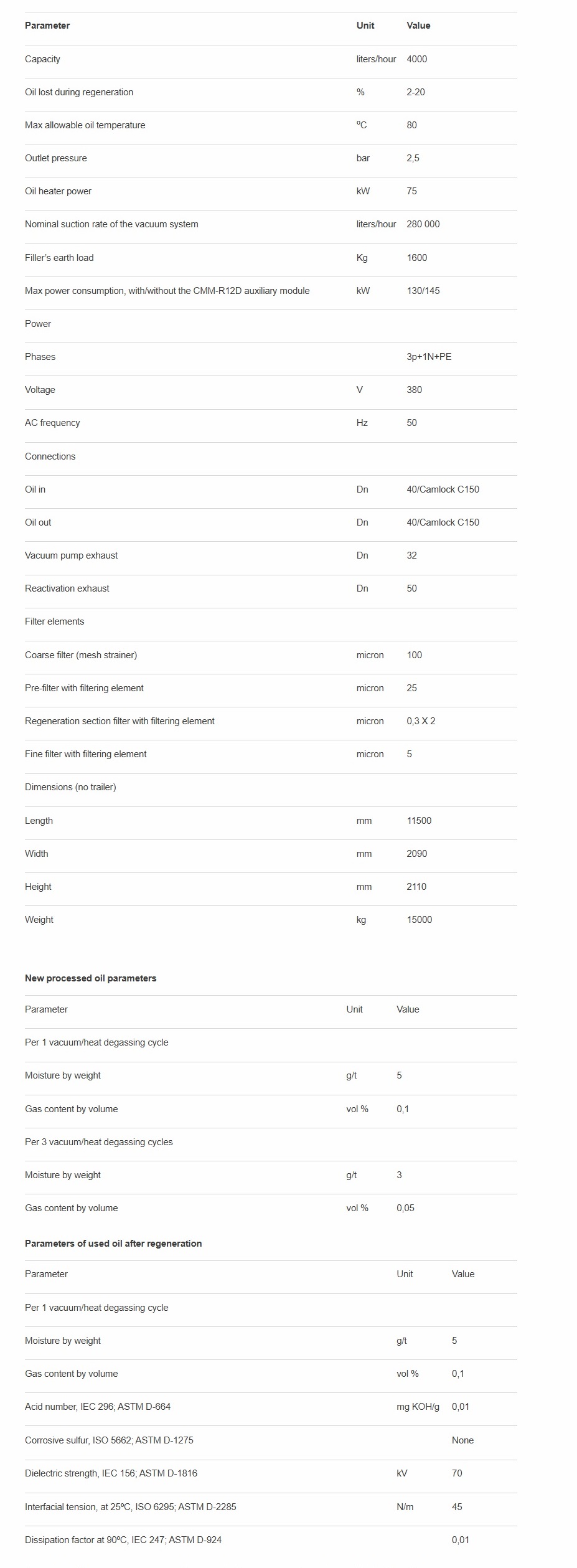 The unit is designed for regeneration of mineral transformer oil.