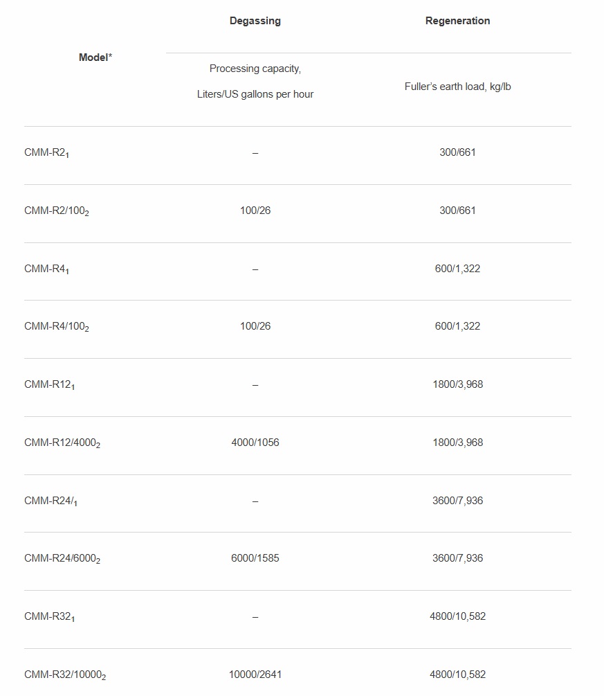 Processing capacity of the GlobeCore CMM-R units is defined by two parameters: (1) liters per hour (L.P.H.) and (2) the amount of oil in liters passed through the Fuller’s earth: