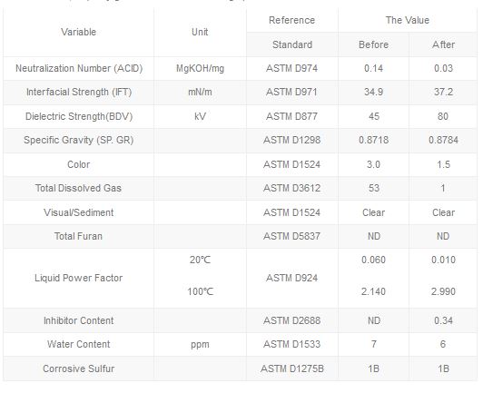 - It can recover aging insulating oil electrical with PH value 25.5, acid value £0.03 mg koH/g, or dielectric loss factors tg5 (90°C) £0.001 back to new oil characteristics.