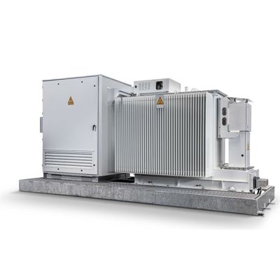 Hermatically sealed type transformer. Special medium-voltage and low-voltage bushings. LV bushings mounted on the tank bottom and short side. Painting cathegory suitable for high corrosive ambient conditions. +50°C Ambient temperature. Mounted on skid basis and connected to MV Switchgear.