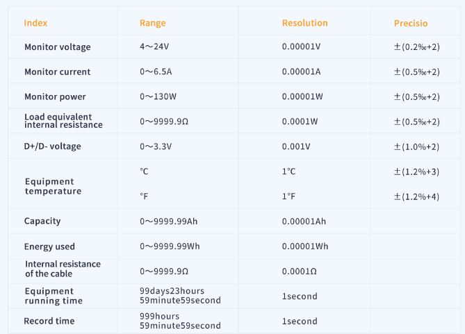 Monitoring voltage: 4~24V. Monitor voltage resolution: 0.00001V. Monitoring voltage accuracy: ±(0.2‰+2). Monitoring current: 0~6.5A. Display current resolution: 0.00001A. Monitoring current accuracy: ±(0.5‰+2). Display power: 0~130W. Display current resolution: 0.00001W. Monitoring current accuracy: ±(0.5‰+2). Load equivalent resistance: 0~9999.9Ω. Load equivalent resistance resolution: 0.0001Ω. Load equivalent resistance accuracy: ±(0.5‰+2). Capacity: 0~9999.99Ah. Use energy: 0~9999.99Wh. Cable resistance: 0~9999.9Ω. D+/D- voltage: 0~3.3V. D+/D- voltage resolution: 0.001V. D+/D- voltage accuracy: ±(1.0%+2). Equipment temperature: ?/?. Package size: 50*25*8mm / 1.97* 0.98 * 0.31in. Package weight: 47g / 1.66oz.