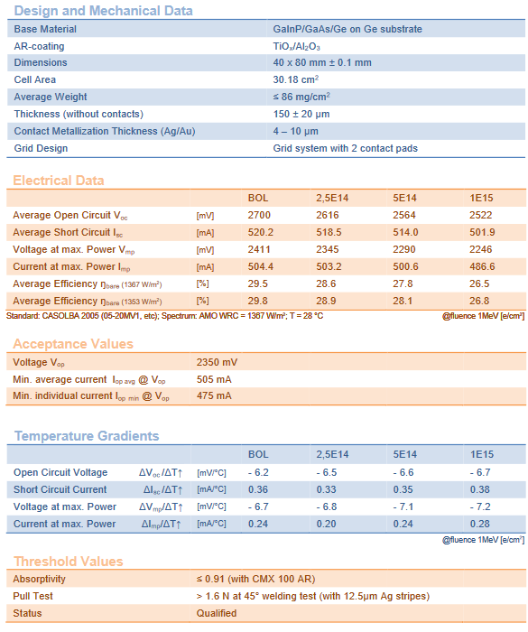 This cell type is a GaInP/GaAs/Ge on Ge substrate triple junction solar cell (efficiency class 30% advanced). The end-of-life version of the 3G30C solar cell offers best EOL-performance values and should be combined with an external bypass diode protection.