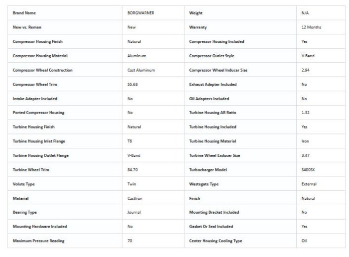 AirWerks Series, S400SX TURBO, Compressor Wheel O.D. 3.94 in - 100.17mm, Compressor Wheel Inducer Diameter 2.94 in - 74.56mm, Turbine Wheel O.D. 3.77in - 95.70mm, Turbine Wheel Exducer 3.47in - 88.05mm, T6 Inlet, Turbine Housing AR 1.32.