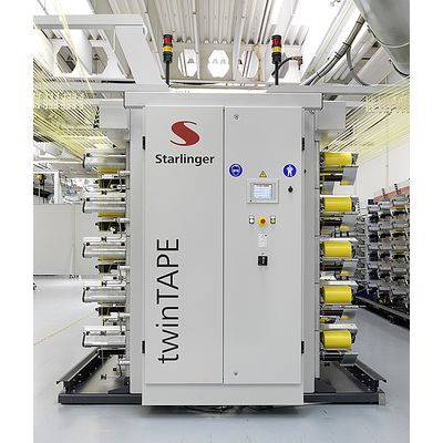 The twinTAPE 200LX operates with cores of 35 mm internal diameter and achieves a working speed of up to 600 m/min. With the newly developed and patented traverse system the traverse stroke can be set variably, thus no extra parts are required when the bobbin design is changed. Automatic bobbin change after reaching the predetermined winding length saves manpower and ensures the production of tape bobbins with equal running length. The new graphical human-machine-interface facilitates intuitive navigation and allows the saving of individual tape parameters in the recipes store.