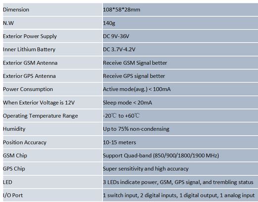 QUECTEL GSM module and Ublox GPS chipset. Track by cell phone / PC. Alarm types: Over-speed. Low power. Geo-fence. Tremble. Parking. SOS. Exterior power off. Control car doors close/open, detect the status of engine on/off. Cut off the engine power Gradually and Safely . GPRS(TCP/UDP). SMS Support. When without tremble the device will go into sleep mode. Backup battery, support 14 hours working time.