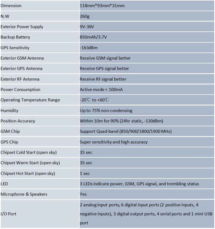 Support single location and continual tracking. Over-speed alarm. Low power alarm. Geo-fence alarm. Tremble alarm. Parking alarm. SOS alarm. Control car doors close/open, detect the status of engine on/off. Cut off the engine power gradually and safely when in urgency . GPRS (TCP/UDP). SMS support. When without tremble, the device will go into sleep mode.