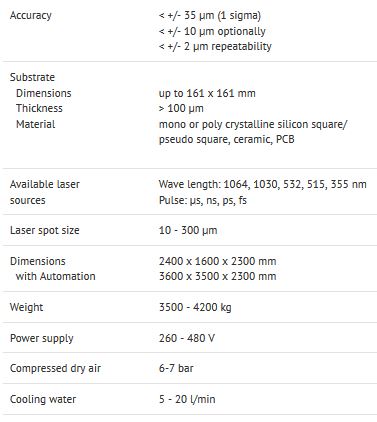 The ULTAGO is a powerful laser processing workstation designed for high-precision applications in the photovoltaic, precision engineering, and electronic industries. It achieves maximum throughput for solar cells or ceramic substrates and is used in high-volume production environments. Different from linear table machines, in the turntable machine loading, unloading, alignment, as well as laser processing are carried out in parallel in order to reach optimum productivity.