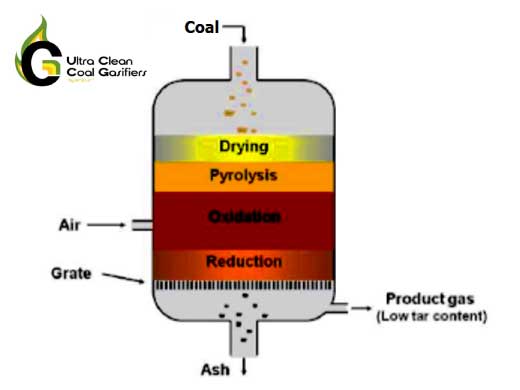 Ankur Scientific offers a completely new process for gasifying coal. The systems offered use a Downdraft process instead of the conventional updraft process. The updraft process (as is used) is one where the coal is fed into the gasifier from the top and the gas is also taken out from top. This leads to the gas entraining a lot of tar along with it as the gas needs to pass through the Pyrolysis zone which is where the tars come out. In the downdraft process on the other hand, the coal is fed from the top while the gas generated is taken out from the bottom. This leads to the gas being almost tar free.