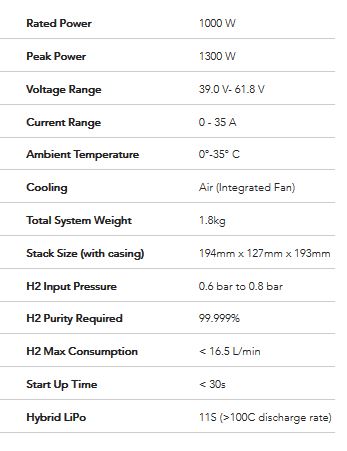 AEROSTAKs are super lightweight hydrogen energy conversion devices that include a special grade PEM fuel cell stack, aerospace-grade control electronics, lightweight casings with integrated air cooling fans and a hybrid LiPo-compatible hybrid electronic board. See below for our different product specifications.