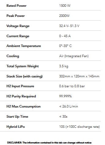 AEROSTAKs are super lightweight hydrogen energy conversion devices that include a special grade PEM fuel cell stack, aerospace-grade control electronics, lightweight casings with integrated air cooling fans and a hybrid LiPo-compatible hybrid electronic board. See below for our different product specifications.