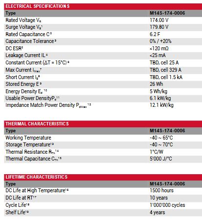 Rated voltage 174VDC. 6.2F capacitance. Resistive cell balancing. Compact and light weight package. Based on 360F hermetically sealed cells. PCB push-in connections.