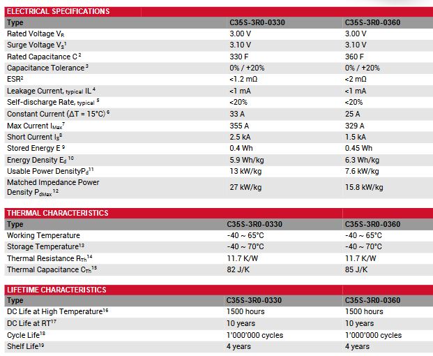 Rated voltage 3VDC. 330F and 360F capacitance. Ultra-low ESR. High cycle life of 1 million cycles. Very high energy and power density. Hermetically sealed cell. All laser welded design. Radial terminals for PCB mounting.