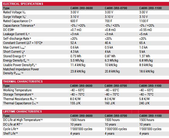 Rated voltage 3VDC. 600,700F and 11 OOF capacitance. High cycle life of 1 million cycles. Very high energy and power density. Laser-weldable terminals. Environmentally friendly product