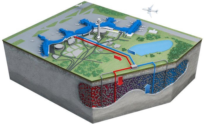 ATES can achieve seasonal energy efficiency ratio values of over 60 – that’s about four to six times more efficient than conventional heating and cooling systems. Efficiencies are generally measured as a ratio of electrical power input to thermal power output from a system. ATES is highly energy efficient because it is not necessary to burn fossil fuels or use electricity to heat or cool water on demand. Instead, an ATES system takes advantage of natural heating and cooling available during summer and winter and stores that heat in an aquifer until the following cooling or heating season when it can be used. The high specific heat capacity of water and the nature of groundwater flow in porous media make an aquifer an excellent medium with which to store and recover heat. The cycle is repeated seasonally, and there is no net withdrawal or addition of water to the aquifer system. Simply stated, it is more efficient to move heat around than it is to generate heat or cold on demand.