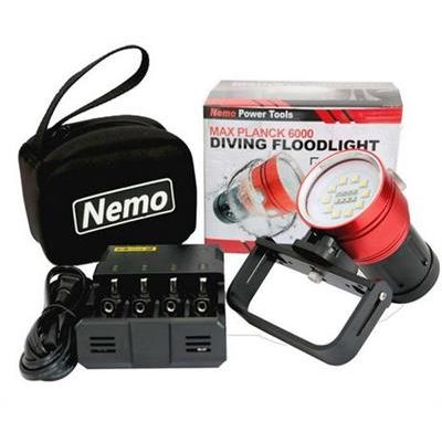 The Max Planck 6000 is a 6000 lumen, 120-degree wide angle LED floodlight. Constructed of aircraft-grade anodized aluminum, Nemo’s flagship dive light features 3 intensity settings (25%, 50% and 100%), operating up to one hour on the highest setting. Additional color settings include a blue-light fish attractor mode, a static red-light mode for professional underwater photography and color balancing, and a flashing red-light mode. Uses include wide angle illumination, professional underwater photography, videography, and nighttime search and rescue. Designed by Nemo Power Tools for commercial divers and professional underwater photographers, this powerful light uses 10 CREE LEDs to create three intensity levels and multiple colour modes.
