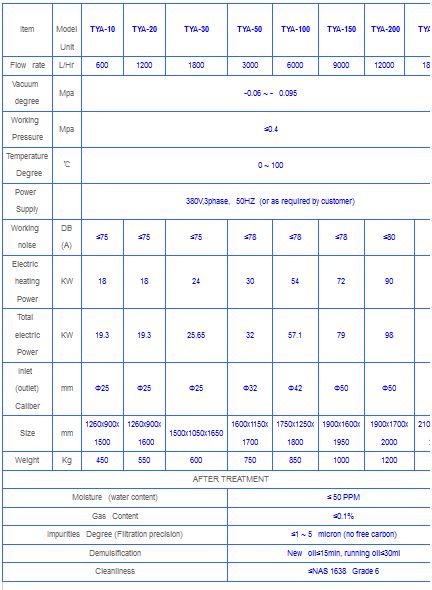 Series TYA vacuum stainless steel lube oil purifier is manufactured of high quality stainless steel material for the whole machine body, it is mainly for purifying unqualified lubricating oil, hydraulic oil, compressor oil, refrigeration oil and other industrial oils which may contain high content acidity, this machine can rapidly separate water, gas, particles, acidity and volatile matter (such as alcohol, gasoline, ammonia, etc.) from oil, restoring oil viscosity, flash point and performance.