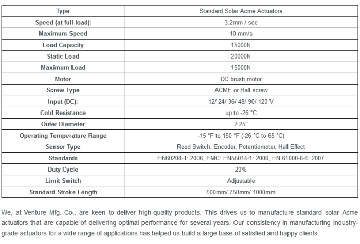 Actuators are used in almost every application, which requires a free, and smooth linear motion. Solar tracking is not an exception to this, and so linear actuators are being used widely in these applications. There are different types of actuators specially designed for use in the solar tracking applications, in order to meet all the requirements, and deliver optimal performance. Venture Mfg. Co. is one of the most leading manufacturers of standard solar Acme actuators in the US, with several years of experience in the same.
