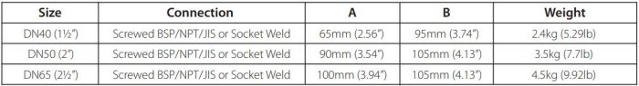 DN40 (1 ½”) - DN65 {2 ½”) Screwed (BSP/NPT/JIS) & Socket Weld