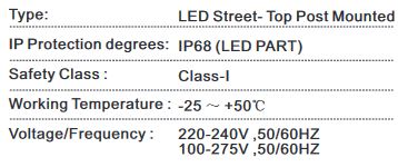 Street of top post designed for vertical installation. Aluminum body and anti-Shock & UV PC diffuser from LED Module .which is in high-strength without broken. LED is made of PHILIPS Lumileds 3030 & 5050. Available in various finishes : white , grey, black ,etc,