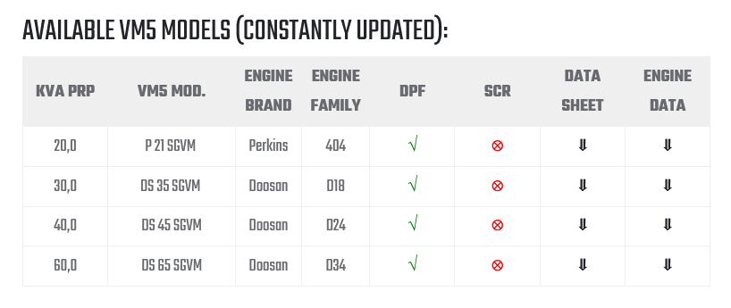 The generating sets of the Onis Visa VM5 Range are designed for the construction sector. Our VM5 gensets Construction range is equipped with Stage V engines, high-quality components, high standard equipment and strict compliance with current environmental and acoustic regulations are just some of its assets, in order to meet the most demanding needs of the construction sector.