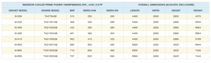 Radiator cooled prime power 1500RPM(50HZ) 3PH., 415V, 0.8 PF.