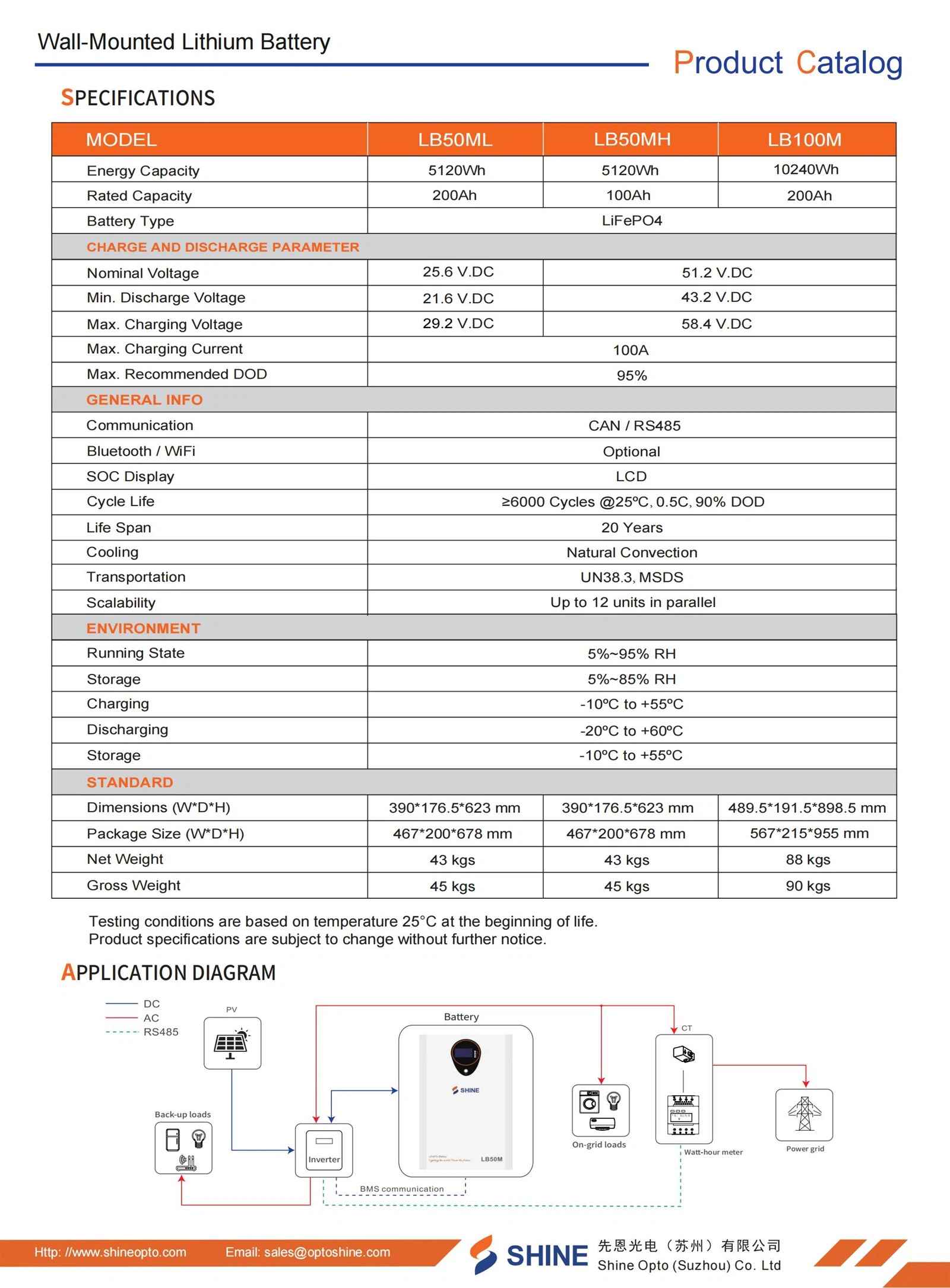 LB50MH Wall Mounted Lithium Battery 51.2V 100AH: 51.2V voltage, 5120wh,10240wh capacity, ≥6000 cycles lifetime, 5/7/10 years warranty.